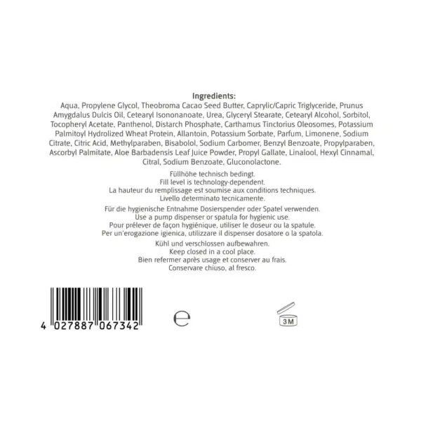 Aqua, Propylene Glycol, Theobroma Cacao Seed Butter, Caprylic/Capric Triglyceride, Prunus Amygdalus Dulcis Oil, Cetearyl Isononanoate, Urea, Glyceryl Stearate, Cetearyl Alcohol, Sorbitol, Tocopheryl Acetate, Panthenol, Distarch Phosphate, Sodium Citrate, Potassium Palmitoyl Hydrolyzed Wheat Protein, Carthamus Tinctorius Oleosomes, Citric Acid, Allantoin, Potassium Sorbate, Parfum, Citral, Methylparaben, Bisabolol, Sodium Carbomer, Hexyl Cinnamal, Propylparaben, Ascorbyl Palmitate, Aloe Barbadensis Leaf Juice Powder, Gluconolactone, Propyl Gallate, Sodium Benzoate, Linalool, Pinene, Citrus Limon Peel Oil, Benzyl Benzoate, Citrus Aurantium Peel Oil, Limonene.