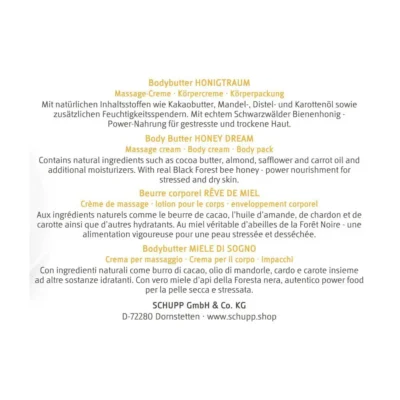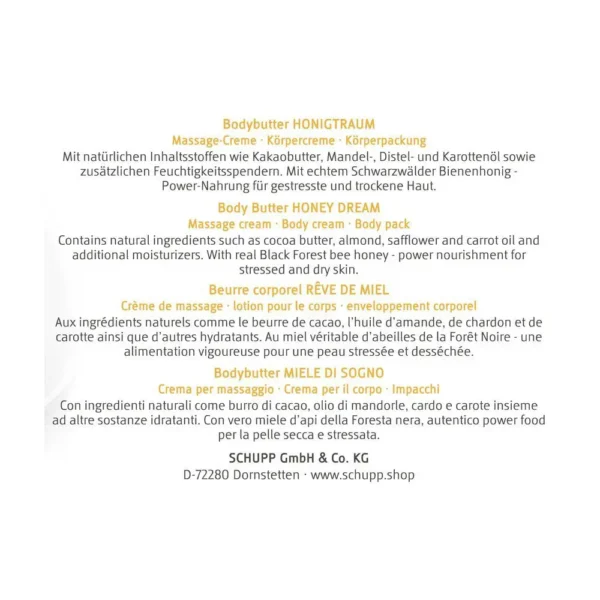 „Honey Dream“ – tikras supermaistas jūsų odai. Jo sudėtyje esantys natūralūs komponentai, tokie kaip morkų aliejus, vitaminas E, alantoinas ir alavijas, užtikrina švelnią, bet intensyvią priežiūrą. Tinka naudoti kaip kūno kremą arba kaip puikią priemonę SPA procedūroms – kūno įvyniojimams.