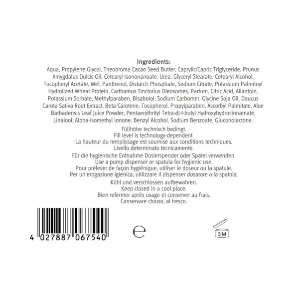 Aqua, Propylene Glycol, Theobroma Cacao Seed Butter, Caprylic/Capric Triglyceride, Prunus Amygdalus Dulcis Oil, Cetearyl Isononanoate, Urea, Glyceryl Stearate, Cetearyl Alcohol Tocopheryl Acetate, Mel, Panthenol, Distarch Phosphate, Sodium Citrate, Potassium Palmitoyl Hydrolyzed Wheat Protein, Carthamus Tinctorius Oleosomes, Parfum, Citric Acid, Allantoin, Potassium Sorbate, Methylparaben, Bisabolol, Sodium Carbomer, Glycine Soja Oil, Daucus Carota Sativa Root Extract, Beta-Carotene, Tocopherol, Propylparaben, Ascorbyl Palmitate, Aloe Barbadensis Leaf Juice Powder, Pentaerythrityl Tetra-di-t-butyl Hydroxyhydrocinnamate, Gluconolactone, Alpha-Isomethyl Ionone, Linalool, Tetramethyl Acetyloctahydronaphthalenes.