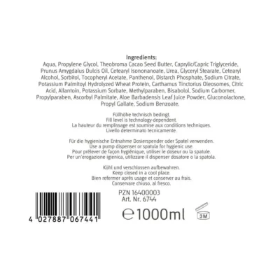 Aqua, Propylene Glycol, Theobroma Cacao Seed Butter, Caprylic/Capric Triglyceride, Prunus Amygdalus Dulcis Oil, Cetearyl Isononanoate, Urea, Glyceryl Stearate, Cetearyl Alcohol, Sorbitol, Tocopheryl Acetate, Panthenol, Distarch Phosphate, Sodium Citrate, Potassium Palmitoyl Hydrolyzed Wheat Protein, Carthamus Tinctorius Oleosomes, Citric Acid, Allantoin, Potassium Sorbate, Methylparaben, Bisabolol, Sodium Carbomer, Propylparaben, Ascorbyl Palmitate, Aloe Barbadensis Leaf Juice Powder, Gluconolactone, Propyl Gallate, Sodium Benzoate.
