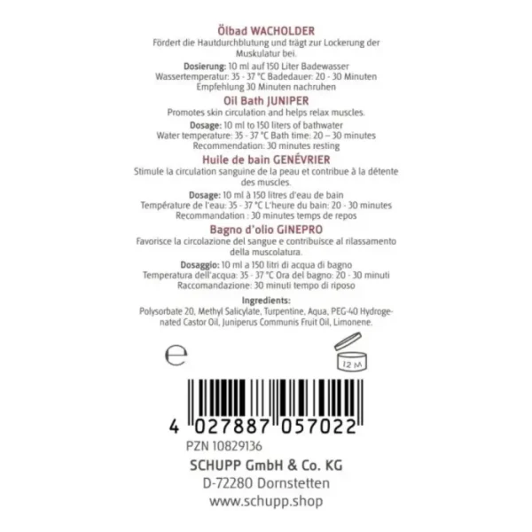 SCHUPP jau daugiau nei 85 metus specializuojasi kurdamas aukščiausios kokybės SPA ir balneoterapijos produktus. SCHUPP vonios aliejai gaminami naudojant kruopščiai atrinktus eterinius aliejus ir augalinius ingredientus, taikomus tiek klasikinėje balneologijoje, tiek profesionaliose sveikatinimo procedūrose.