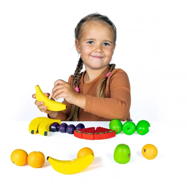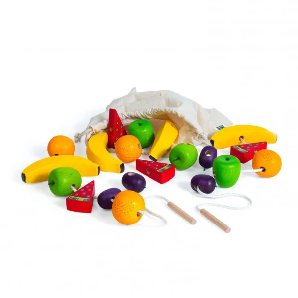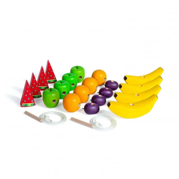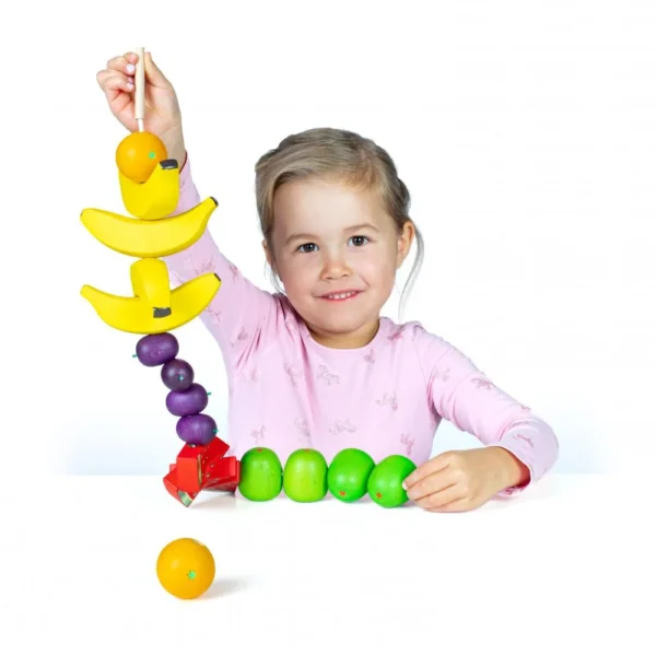 Su 20 ryškių medinių vaisių ir dviem medinėmis adatomis vaikai gali verti, rūšiuoti ar kurti spalvingas sekas, taip lavindami smulkiąją motoriką, koordinaciją ir spalvų pažinimą.